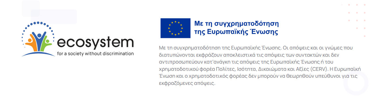 Το συγχρηματοδοτούμενο από την ΕΕ πρόγραμμα ECOSYSTEM αποτελεί μία πρωτοβουλία του Υπουργείου Κοινωνικής Συνοχής και Οικογένειας, της Εθνικής Επιτροπής για τα Δικαιώματα του Ανθρώπου και του ΚΜΟΠ-Κέντρου Κοινωνικής Δράσης και Καινοτομίας με στόχο την προώθηση μιας κοινωνίας χωρίς διακρίσεις και αποκλεισμούς.