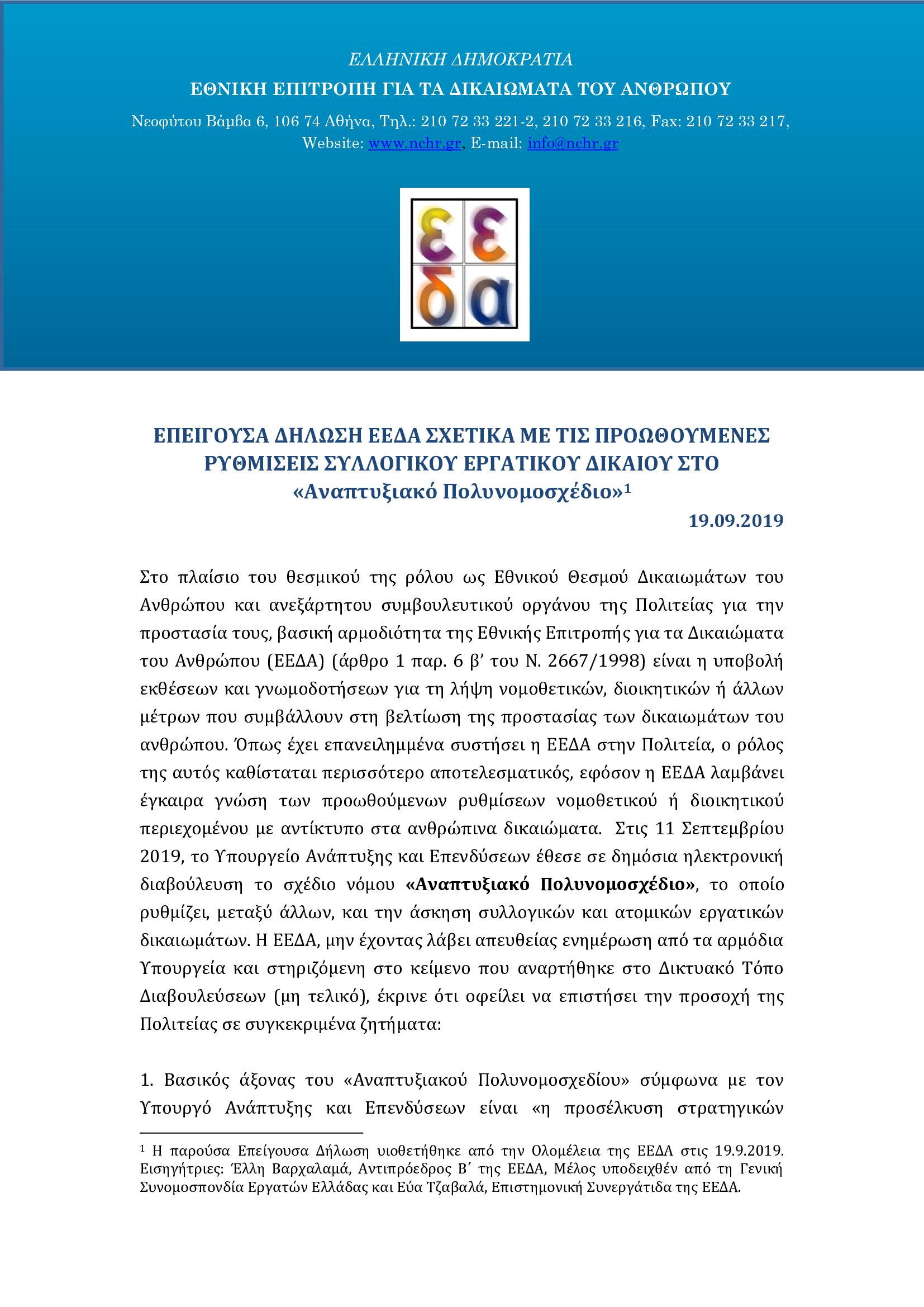 19 Σεπτεμβρίου 2019 Επείγουσα Δήλωση ΕΕΔΑ σχετικά με τις προωθούμενες ρυθμίσεις συλλογικού εργατικού δικαίου στο «Αναπτυξιακό Πολυνομοσχέδιο» Επόμενο