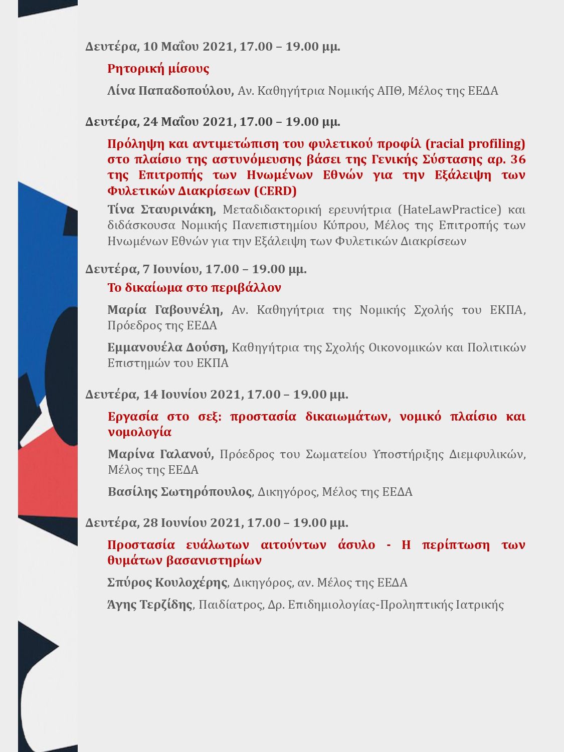 Από τις 8 Φεβρουαρίου έως τις 28 Ιουνίου 2021 πραγματοποιείται διαδικτυακά ο Γ' Κύκλος Σεμιναρίων της Εθνικής Επιτροπής για τα Δικαιώματα του Ανθρώπου (ΕΕΔΑ) με θέμα: "Τα Δικαιώματα του Ανθρώπου στη (μετα) επιδημική εποχή: προκλήσεις και επιστροφή στην "κανονικότητα". Τα Σεμινάρια διεξάγονται πάντα Δευτέρα από τις 17.00 έως τις 19.00 (σύμφωνα με το αναλυτικό πρόγραμμα) και μεταδίδονται ζωντανά από τον ιστότοπο της ΕΕΔΑ και τη σελίδα της ΕΕΔΑ στο Facebook.
