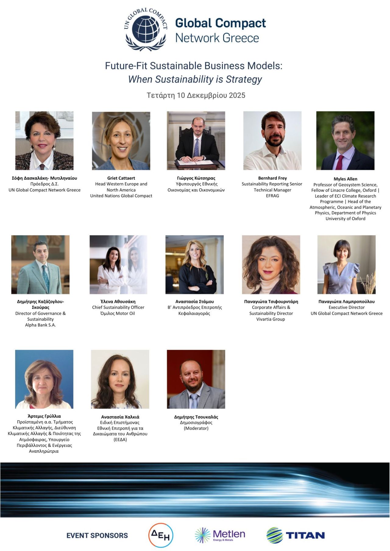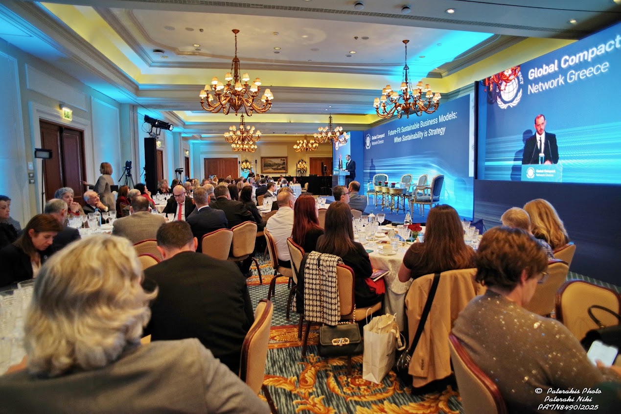 Η Εθνική Επιτροπή για τα Δικαιώματα του Ανθρώπου (ΕΕΔΑ) συμμετείχε στην ετήσια εκδήλωση του UN Global Compact Network Greece με τίτλο “Future-fit Sustainable Business Models: When Sustainability is Strategy”, η οποία πραγματοποιήθηκε στις 10 Δεκεμβρίου 2025, Παγκόσμια Ημέρα Ανθρωπίνων Δικαιωμάτων, στο ξενοδοχείο Μεγάλη Βρετανία.
