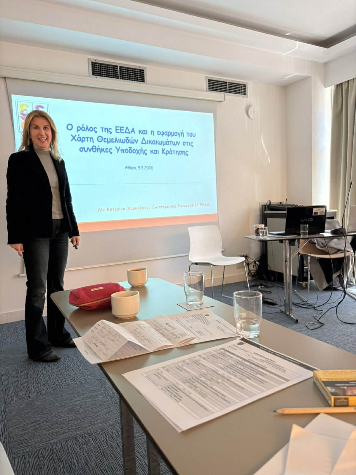 Εκ μέρους της ΕΕΔΑ, η επιστημονική συνεργάτης Κατερίνα Χαροκόπου παρουσίασε στην εισήγησή της το θεσμικό πλαίσιο εφαρμογής του Χάρτη Θεμελιωδών Δικαιωμάτων της ΕΕ στο άσυλο και τη μετανάστευση και τον ρόλο της ΕΕΔΑ στην προστασία των δικαιωμάτων αυτών. Η εισήγηση εστίασε στο δικαίωμα στην αξιοπρέπεια και το δικαίωμα στην ισότητα κατά τις συνθήκες υποδοχής και κράτησης, καθώς και στο θεσμικό πλαίσιο αξιολόγησης της ευαλωτότητας των αιτούντων διεθνούς προστασίας, προσφύγων και μεταναστών που εισέρχονται στην Ελληνική επικράτεια.